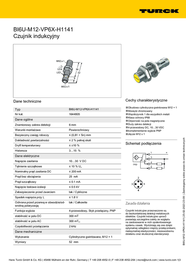 1644805 Czujnik indukcyjny Turck BI6U-M12-VP6X-H1141, 10 - 30 V, 1 szt.