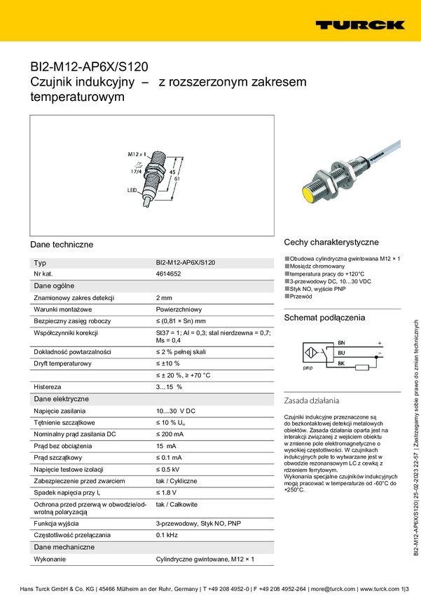 4614652 Czujnik indukcyjny Turck BI2-M12-AP6X/S120, 10 - 30 V, 1 szt.