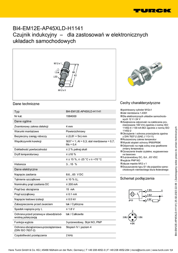 Czujnik indukcyjny Turck BI4-EM12E-AP45XLD-H1141, 8.6 - 65 V, 1 szt.