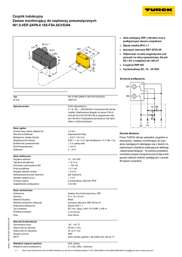 1650123 Czujnik indukcyjny Turck NI1,5-VEP-2AP6-0,185-FS4.4X3/S304, 10 - 30 V,...