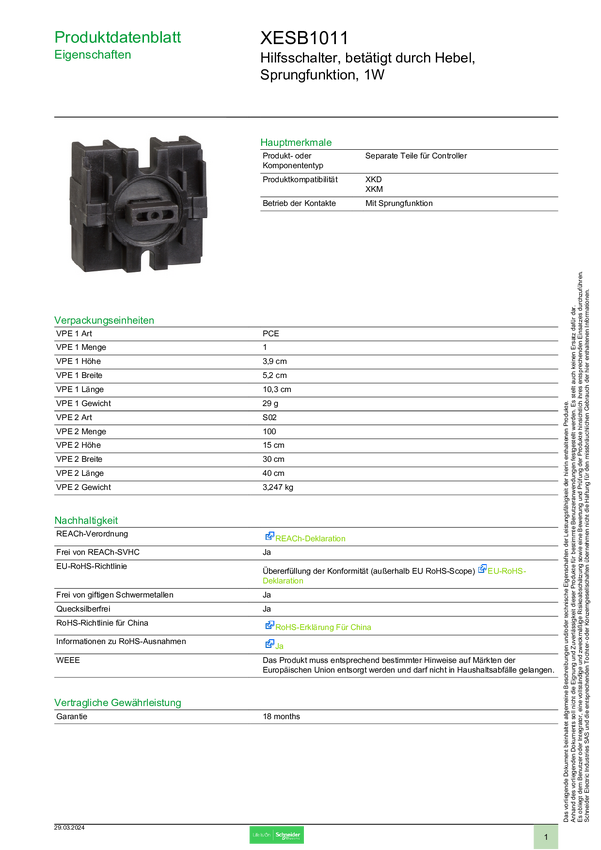 XESB1011 Przełącznik pomocniczy Schneider Electric XESB1011 XESB1011, 1 szt.