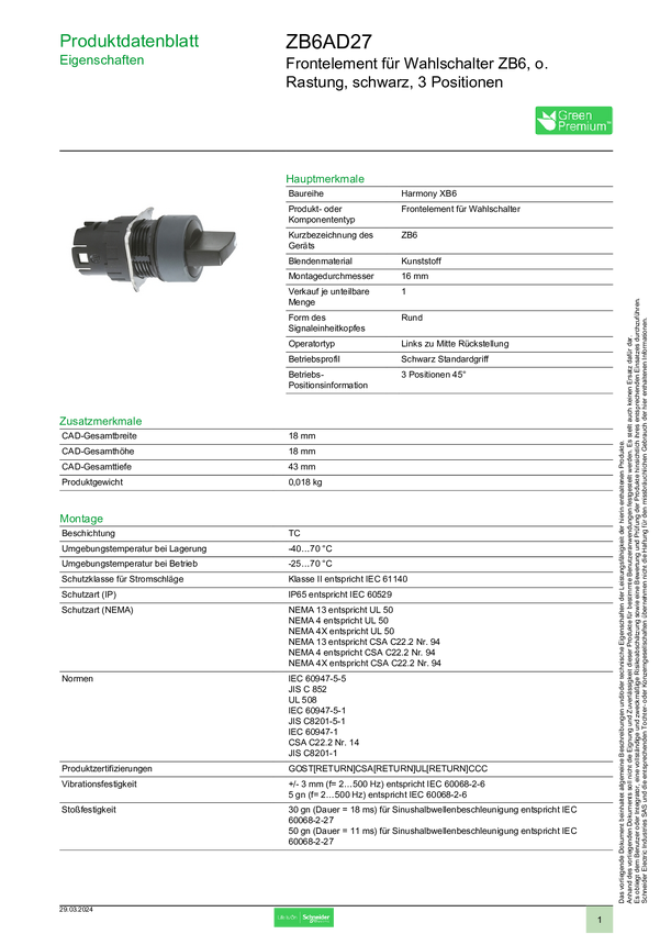 ZB6AD27 Schneider Electric ZB6AD27 ZB6AD27 Przełącznik wyboru, przedni element 1 sz...