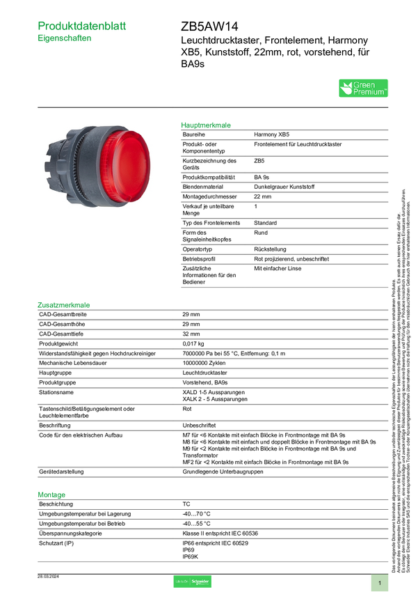 Schneider Electric ZB5AW14 Podświetlany element przedni z przyciskiem 1 szt.