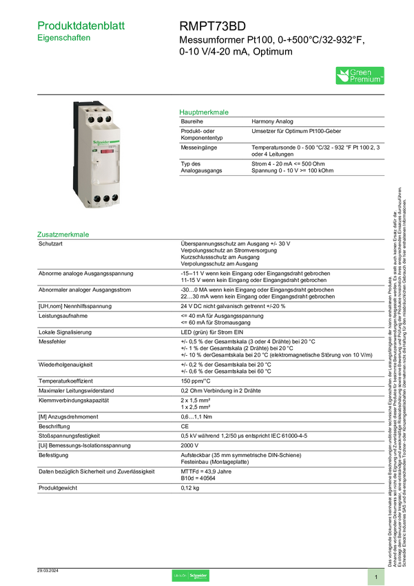 Przetwornik pomiarowy Pt100, 0-+500°C/32-932°F, 0-10 V/4-20 mA, optymalny Schneider Electric RMPT73BD
