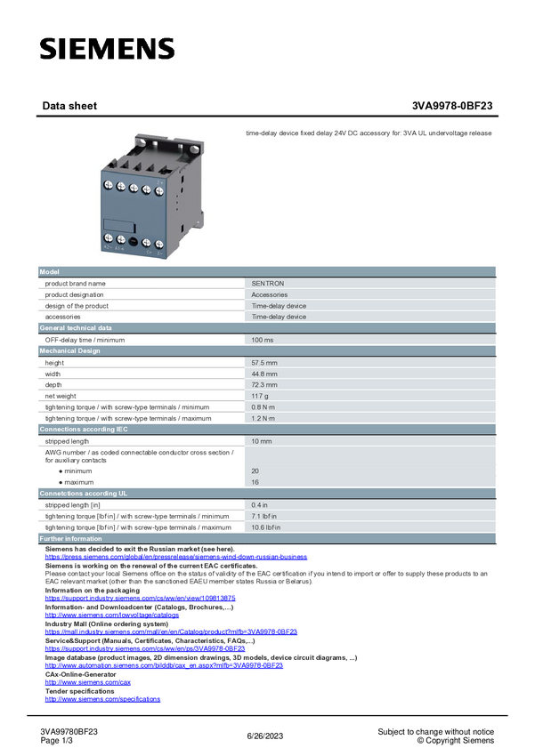 3VA99780BF23 Zestaw akcesoriów Siemens 3VA9978-0BF23 1 szt.