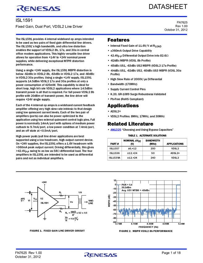 ISL1591 Fixed Gain, Dual Port, VDSL2 Line Driver