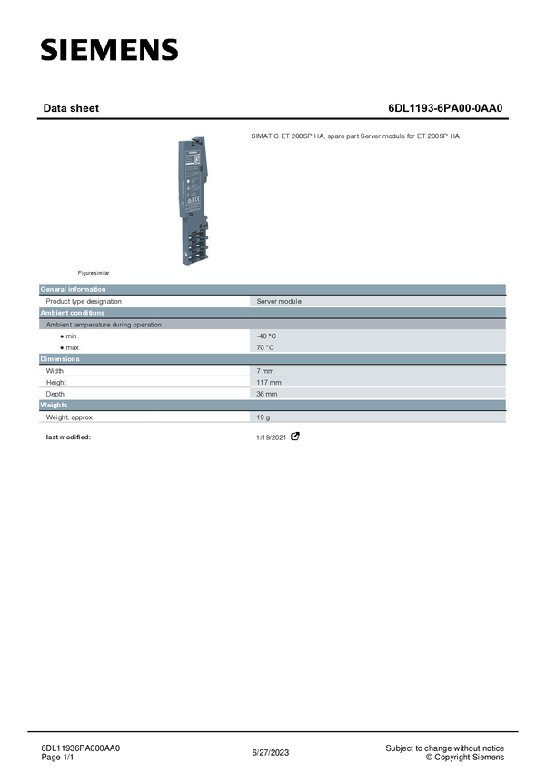 6DL11936PA000AA0 Akcesorium PLC Siemens 6DL1193-6PA00-0AA0 6DL11936PA000AA0