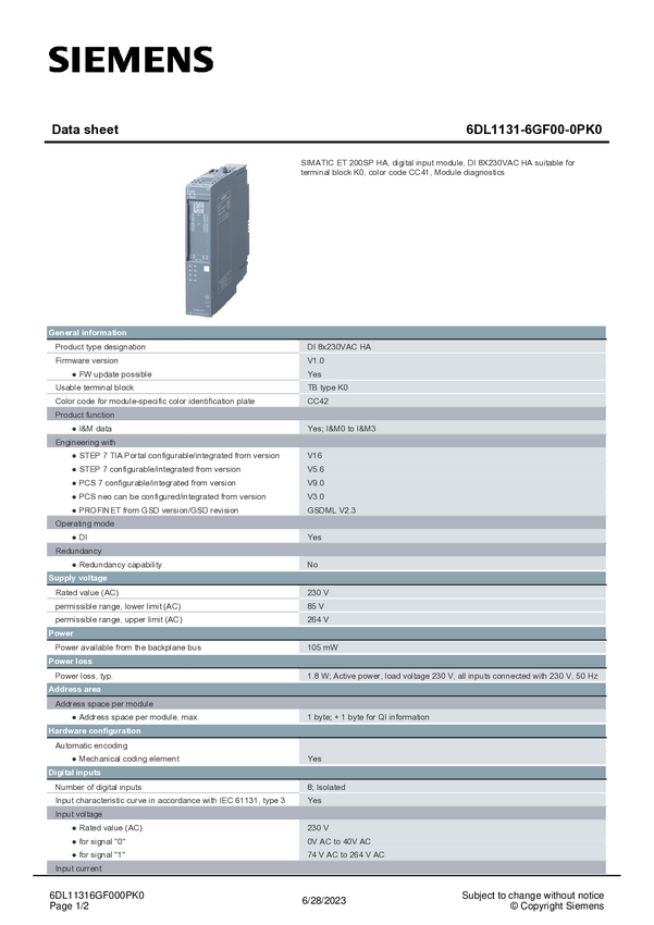 Moduł wejściowy PLC Siemens 6DL1131-6GF00-0PK0 6DL11316GF000PK0