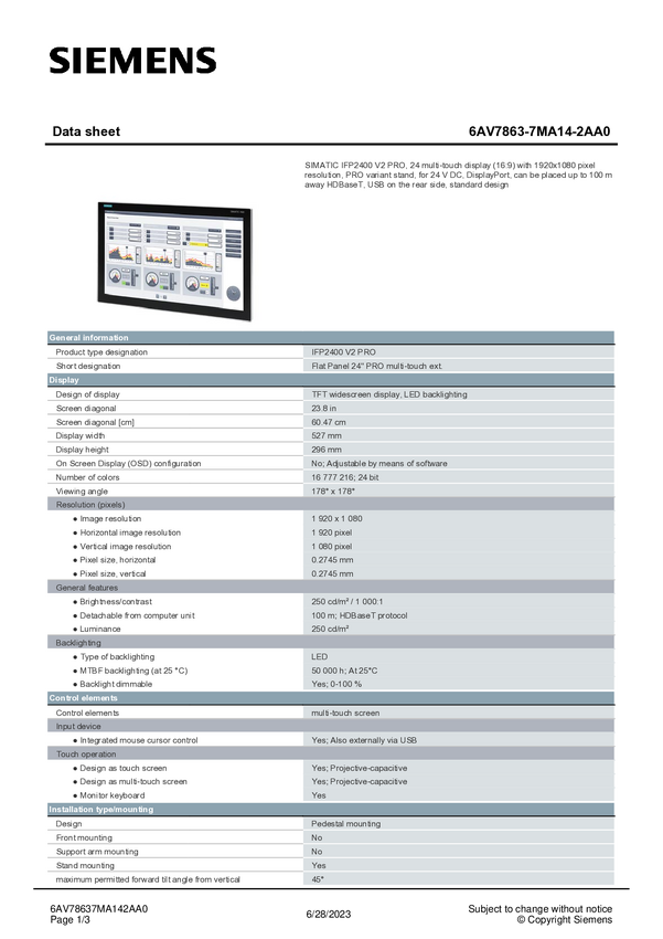 Panel obsługi PLC Siemens 6AV7863-7MA14-2AA0 6AV78637MA142AA0