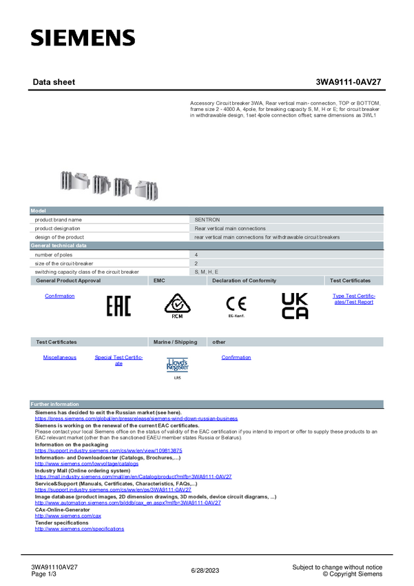 3WA91110AV27 Główne połączenia Siemens 3WA9111-0AV27 1 szt.