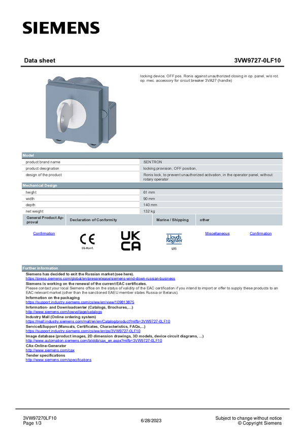 3VW97270LF10 Urządzenie blokujące Siemens 3VW9727-0LF10 1 szt.