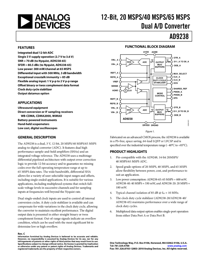 AD9238: Dual 12-Bit, 20/40/65 MSPS, 3 V ADC