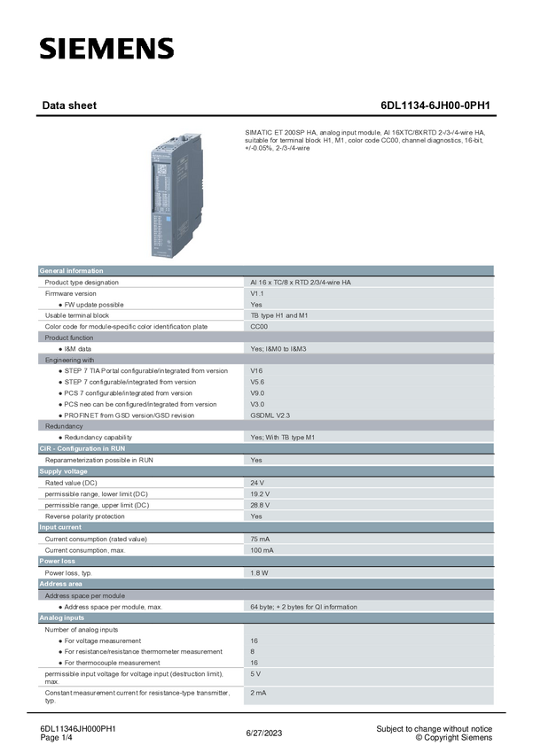 Moduł wejściowy PLC Siemens 6DL1134-6JH00-0PH1 6DL11346JH000PH1