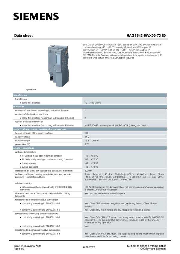 6AG15436WX007XE0 Procesor komunikacyjny PLC Siemens 6AG1543-6WX00-7XE0 6AG15436WX007XE0