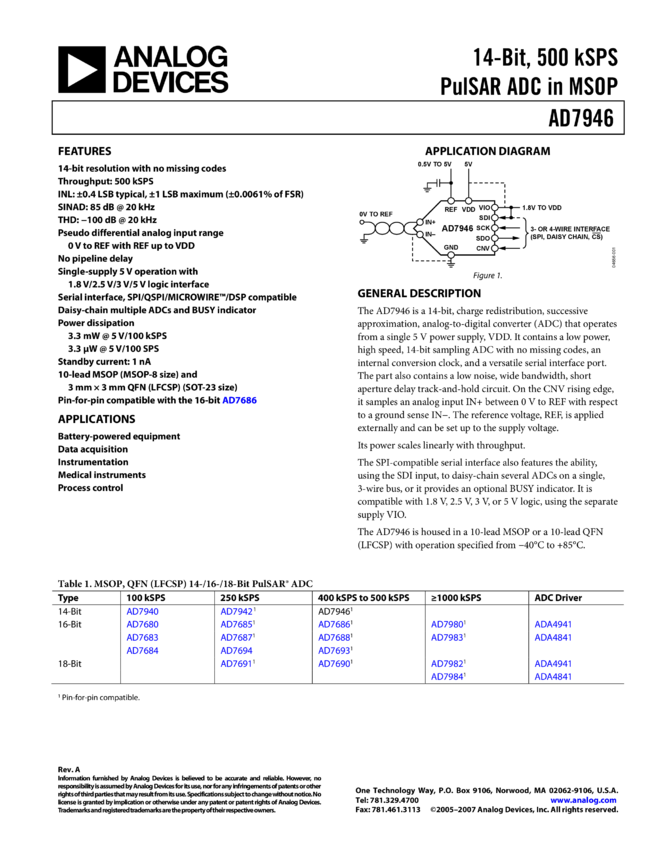 AD7946: 14-Bit, 500 kSPS PulSAR® ADC in MSOP