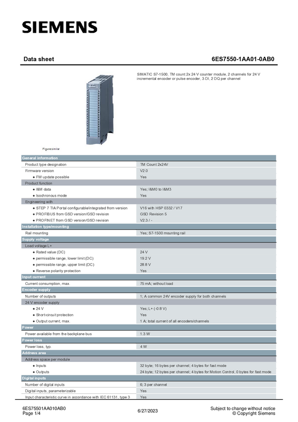 Moduł licznika PLC Siemens 6ES7550-1AA01-0AB0 6ES75501AA010AB0