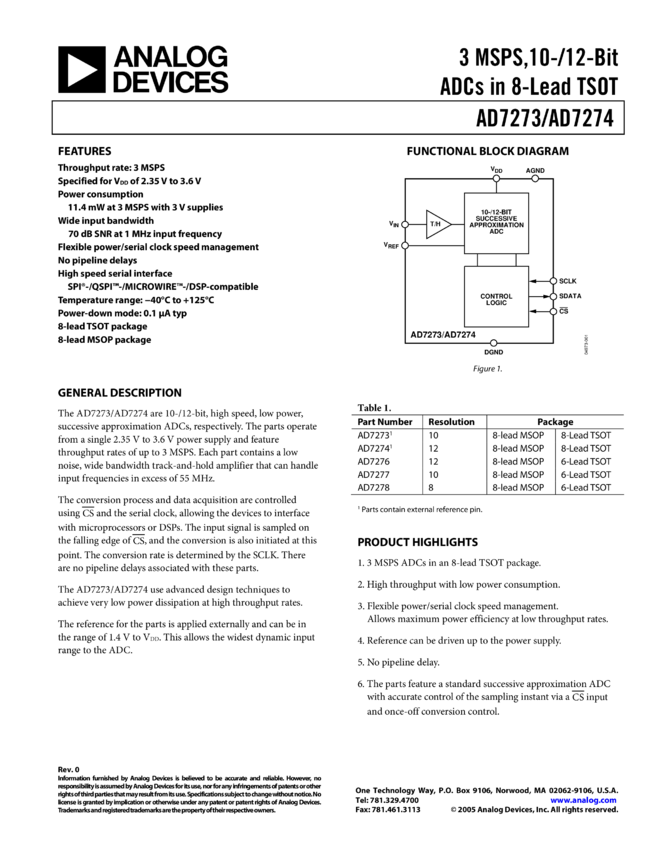 AD7274: 3 MSPS 12-Bit A/D Converter in TSOT and MSOP Packages