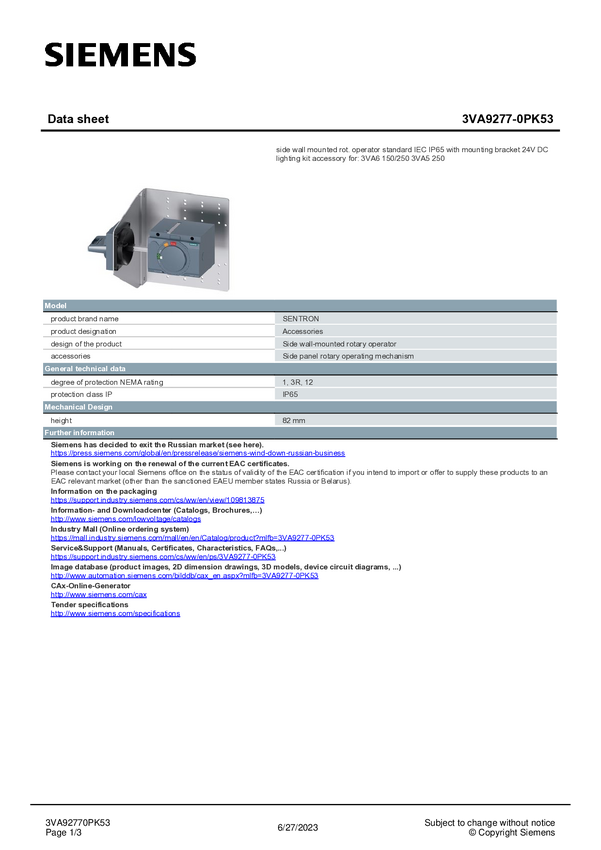 3VA92770PK53 Napęd obrotowy ściany bocznej Siemens 3VA9277-0PK53 1 szt.