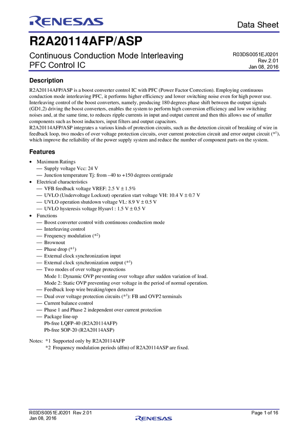 R2A20114AFP ICs for PFC Power Supply