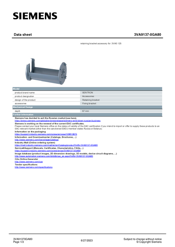 3VA91370GA80 Uchwyt trzymający Siemens 3VA9137-0GA80 1 szt.