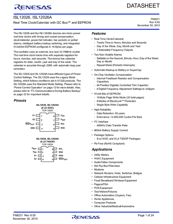 ISL12026IBZ, ISL12026IBZ-T, ISL12026IBZ-T7A, ISL12026IVZ, ISL12026IVZ-T