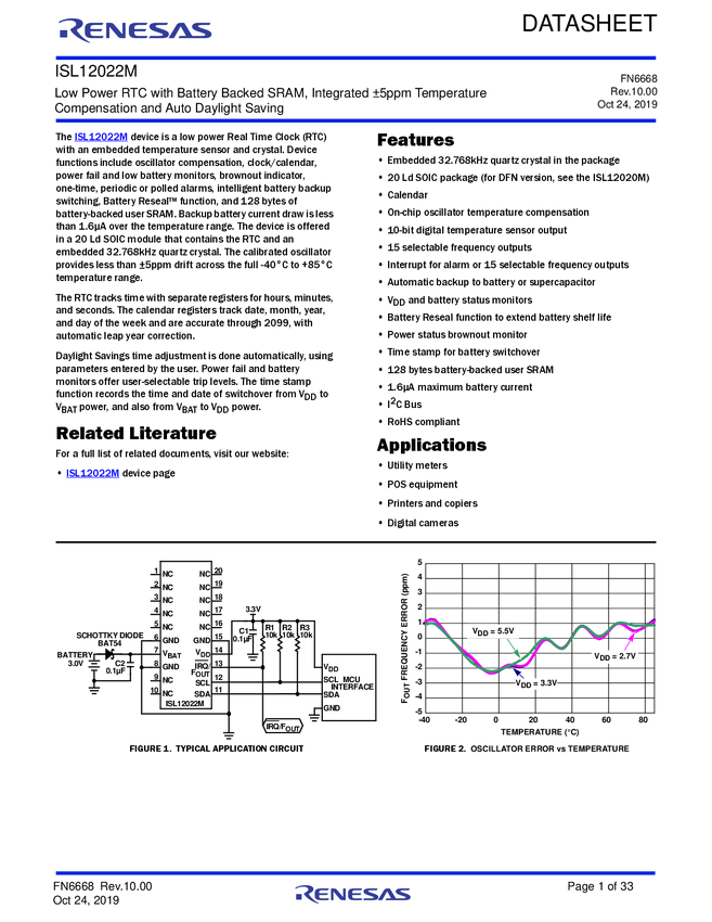 ISL12022M Low Power RTC with Battery Backed SRAM, Integrated ±5ppm Temperature Compen...