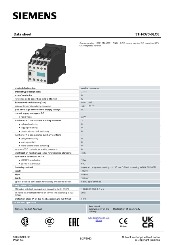 3TH43730LC8 Stycznik pomocniczy Siemens 3TH4373-0LC8 3TH43730LC8, 1 szt.