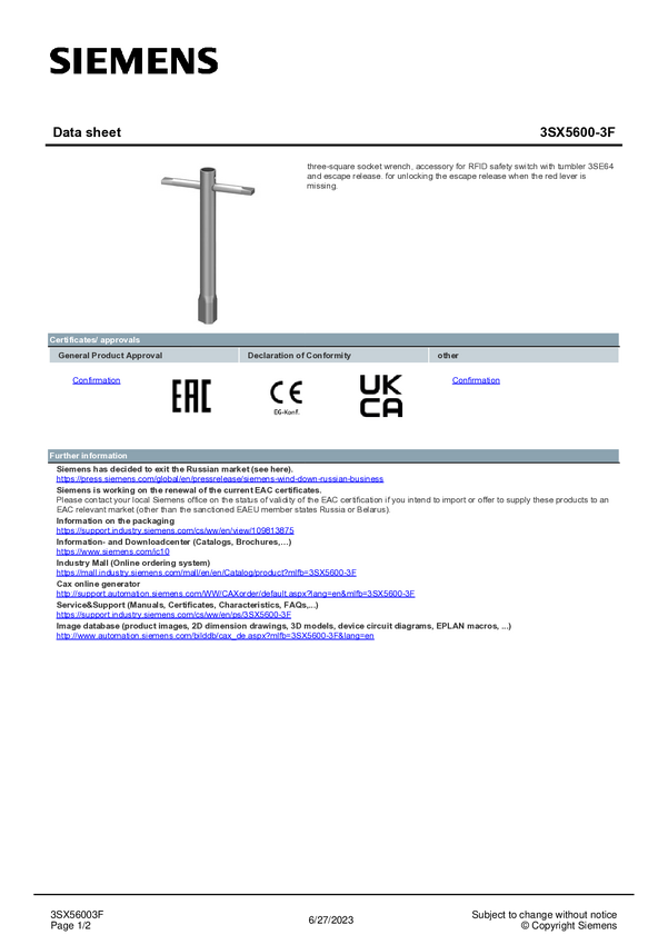 3SX56003F Siemens 3SX56003F Narzędzie montażowe 3SX5600-3F, 1 szt.