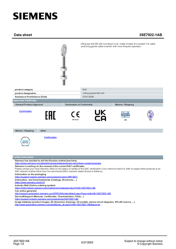 3SE79221AB Siemens 3SE79221AB 3SE7922-1AB Śruby mocujące 1 szt.
