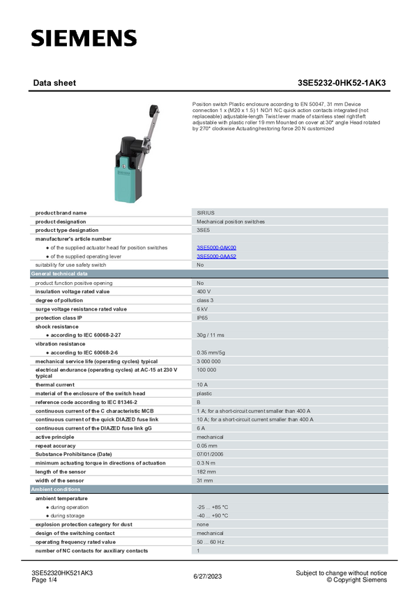 Siemens 3SE52320HK521AK3 3SE5232-0HK52-1AK3 Przełącznik pozycyjny 1 szt.