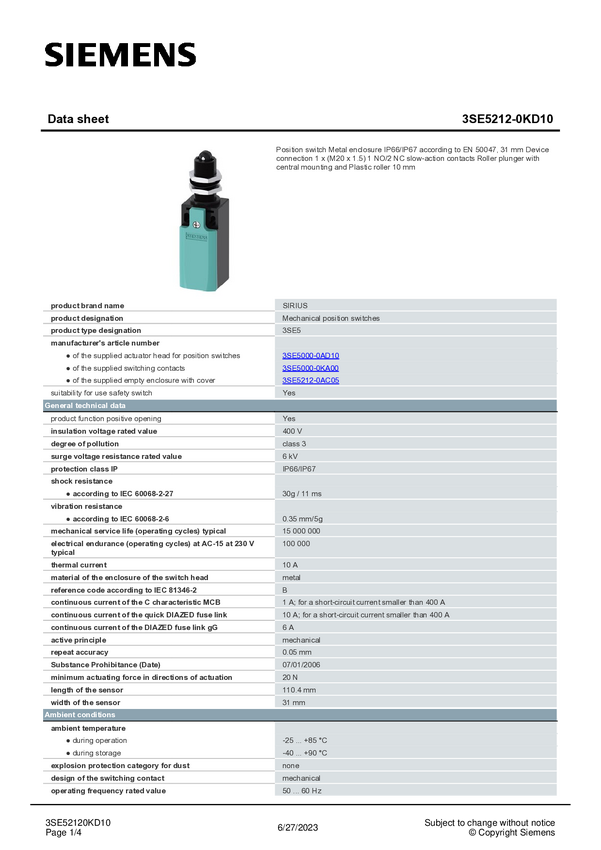 3SE52120KD10 Siemens 3SE52120KD10 3SE5212-0KD10 Przełącznik pozycyjny 1 szt.