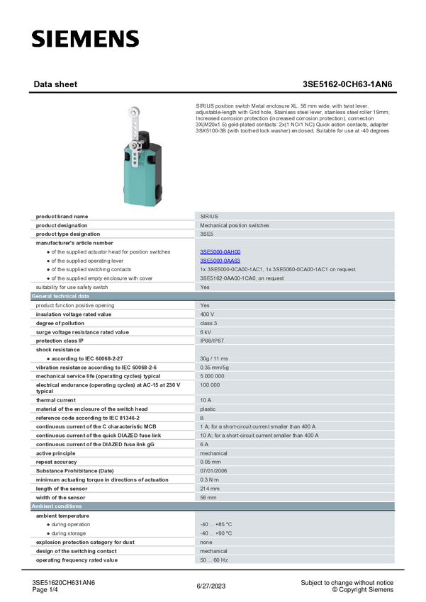 3SE51620CH631AN6 Siemens 3SE51620CH631AN6 3SE5162-0CH63-1AN6 Przełącznik pozycyjny 1 szt.