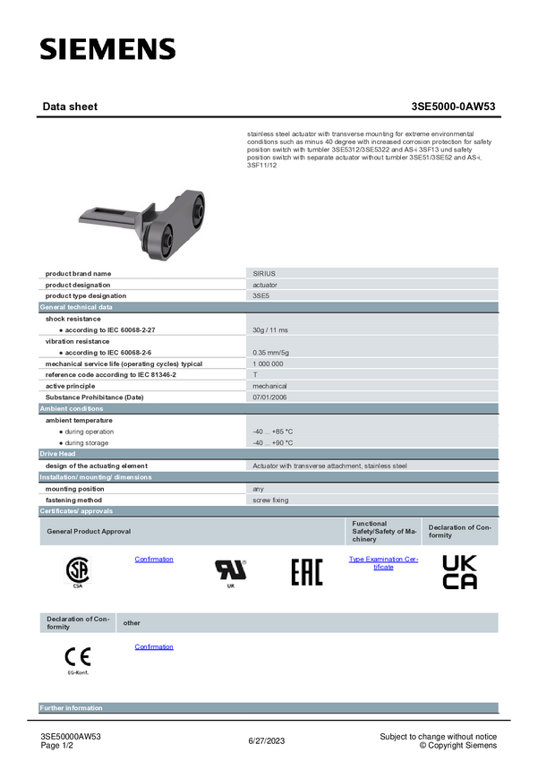 3SE50000AW53 Siemens 3SE50000AW53 Siłownik ze stali nierdzewnej 3SE5000-0AW53, 1 szt.
