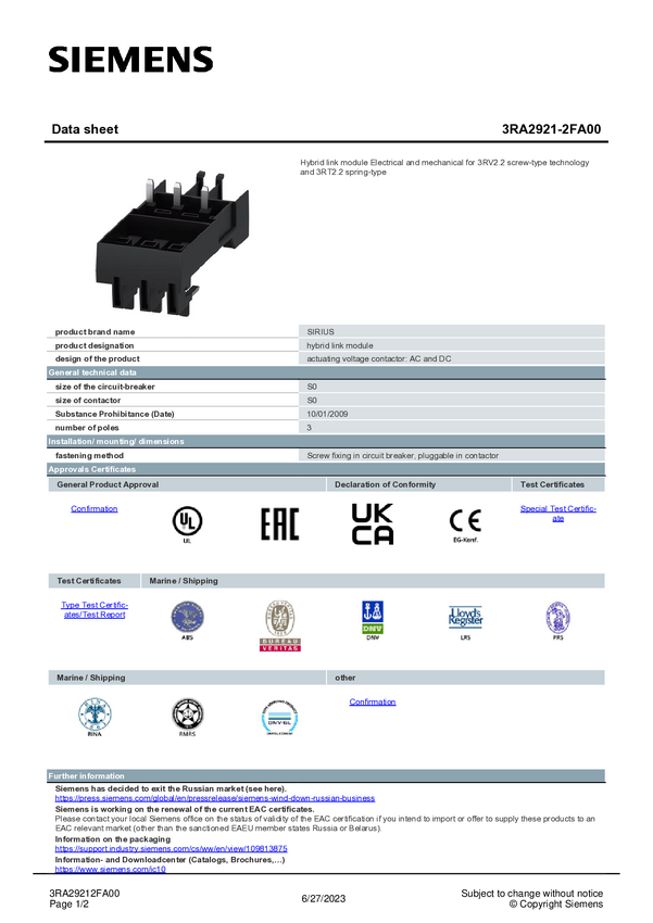 3RA29212FA00 Moduł łączący Siemens 3RA2921-2FA00 3RA29212FA00, 1 szt.