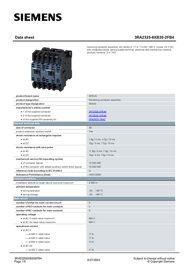 3RA23258XB302FB4 Siemens 3RA2325-8XB30-2FB4 Stycznik pomocniczy 1 szt.