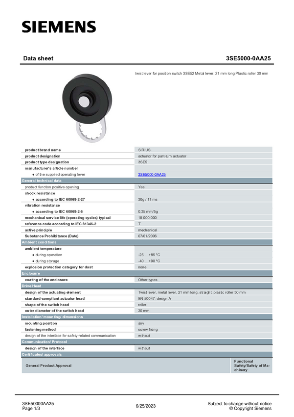 3SE50000AA25 Siemens 3SE50000AA25 3SE5000-0AA25 Dźwignia obrotowa 1 szt.