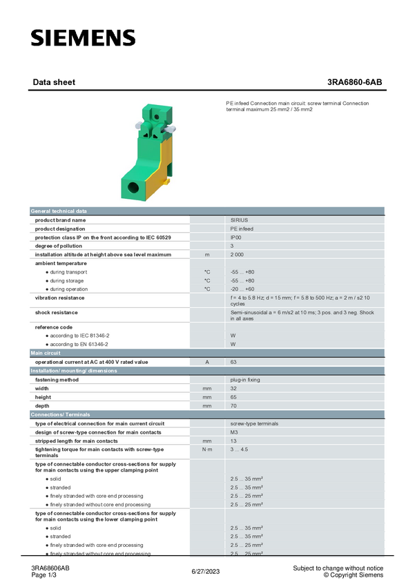 3RA68606AB Podajnik PE Siemens 3RA6860-6AB 1 szt.