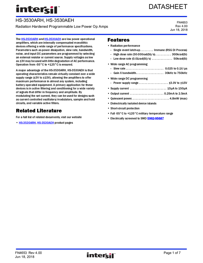 HS-3530ARH Radiation Hardened Programmable Low Power Op Amps