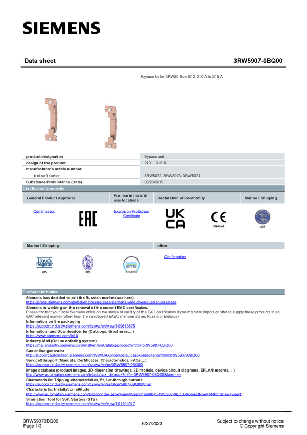 Zestaw Baypass Siemens 3RW5907-0BQ00 3RW59070BQ00