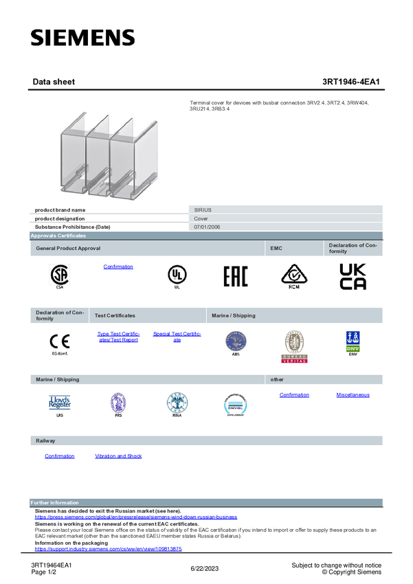 3RT19464EA1 Zaślepka Siemens 3RT1946-4EA1 1 szt.