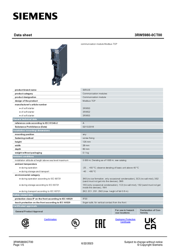 Moduł komunikacyjny Siemens 3RW5980-0CT00 3RW59800CT00