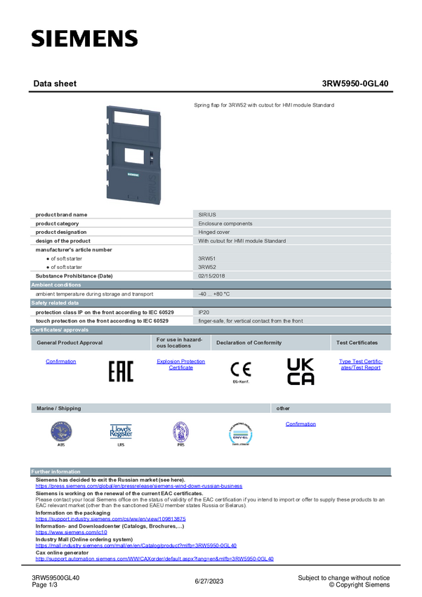 Pokrywa na zawiasach Siemens 3RW5950-0GL40 3RW59500GL40