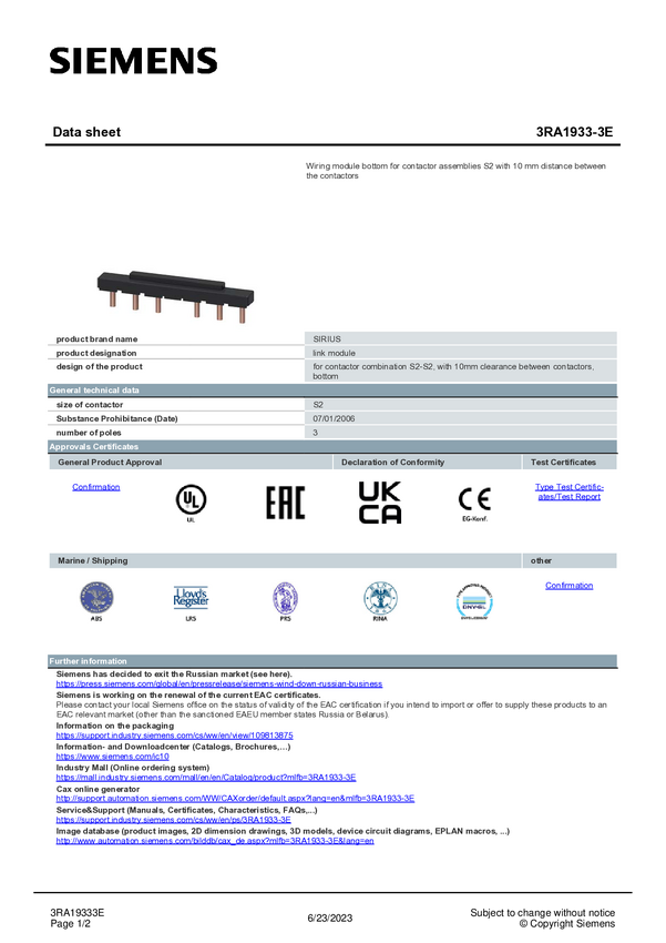 3RA19333E Moduł okablowania Siemens 3RA1933-3E 3RA19333E, 1 szt.