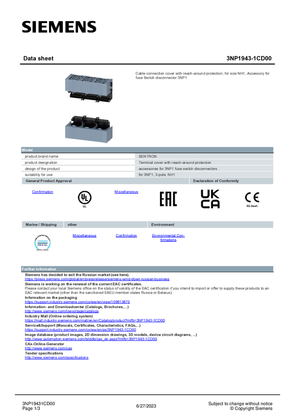 3NP19431CD00 Zaślepka Siemens 3NP1943-1CD00 1 szt.