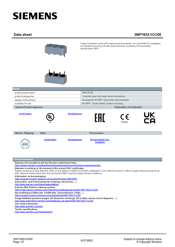 3NP19331CC00 Zaślepka Siemens 3NP1933-1CC00 1 szt.