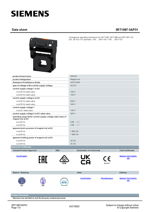 Napęd wymienny Siemens 3RT1987-5AP31 3RT19875AP31, 1 szt.