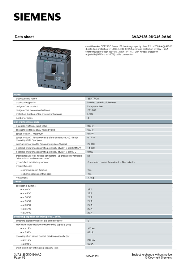 3VA21250KQ460AA0 Wyłącznik zasilania Siemens 3VA2125-0KQ46-0AA0 1 szt.