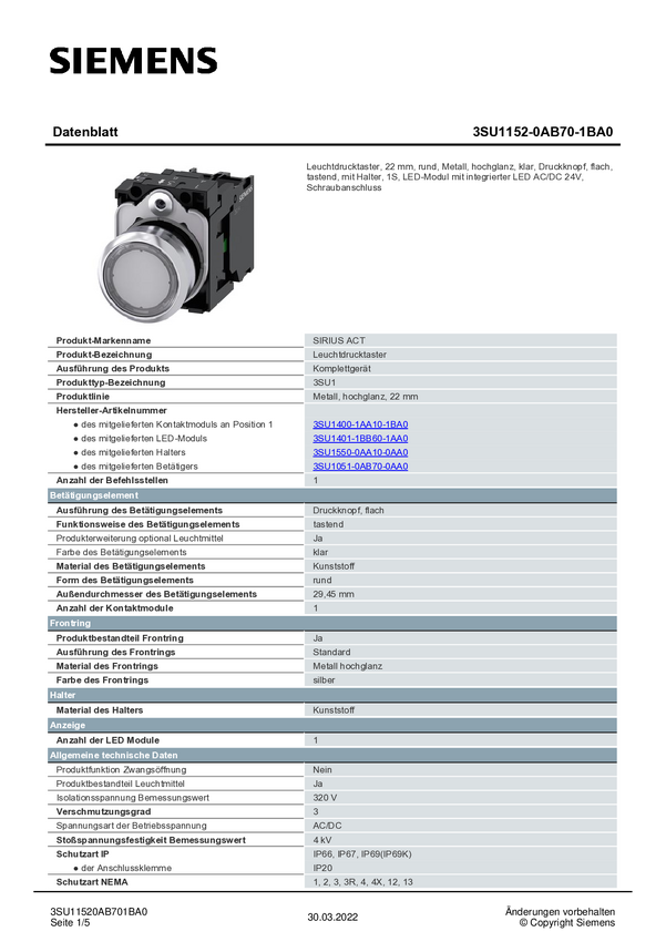 3SU11520AB701BA0 Siemens 3SU11520AB701BA0 3SU1152-0AB70-1BA0 Przycisk podświetlany pierścień...