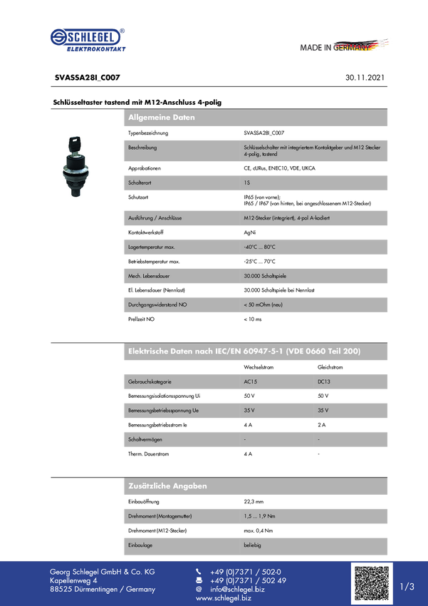 SVASSA28I_C007 Schlegel SVASSA28I_C007 Przełącznik kluczykowy 1 szt.
