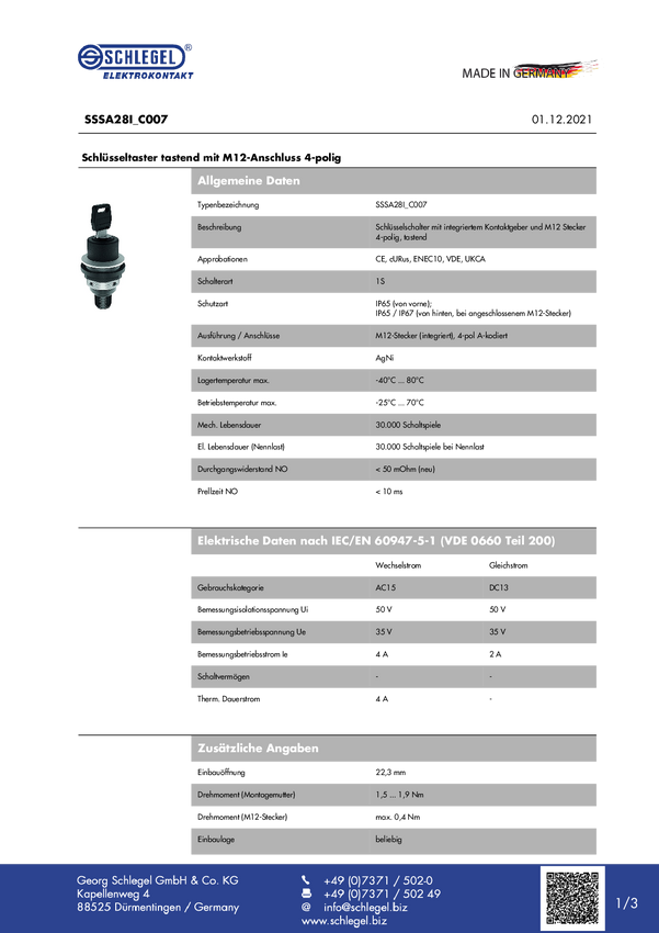 Schlegel SSSA28I_C007 Przełącznik kluczykowy 1 szt.